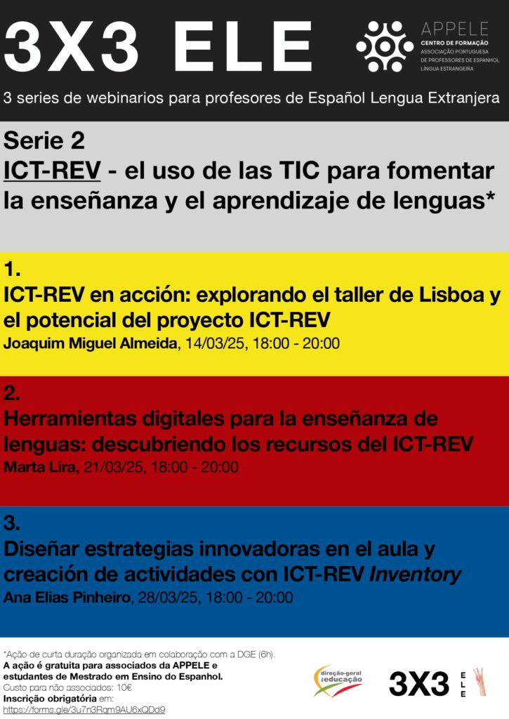 O centro de formação da APPELE vai promover a segunda série do quinto ciclo de webinários 3X3 ELE. Recordamos que cada série de 3 webinários corresponde a uma Ação de Curta Duração a certificar pela nossa associação. A série 2, subordinada ao tema “ICT-REV – el uso de las TIC para fomentar la enseñanza y el aprendizaje de lenguas”, terá início dia 14 de março e, excecionalmente, terá a duração de 6 horas. Encontrarão mais informações no cartaz em anexo. As inscrições poderão ser feitas aqui.