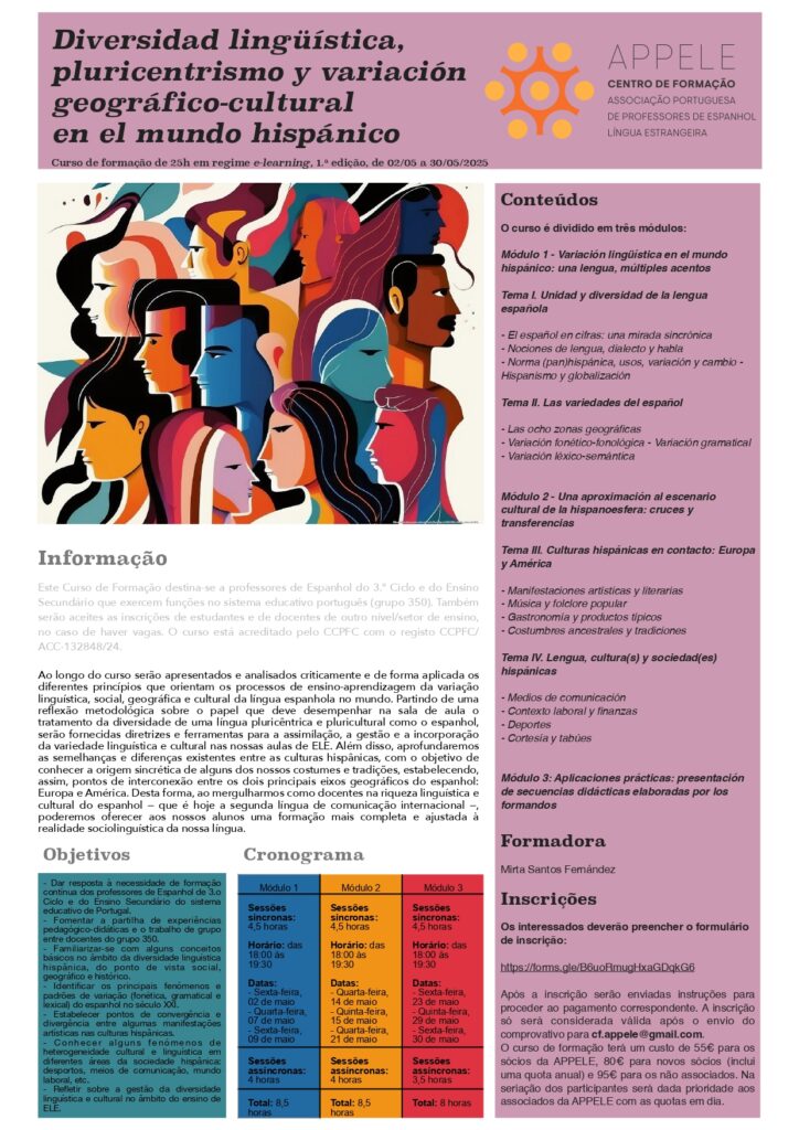 O Centro de Formação da APPELE (CFA) vai levar a cabo, no próximo mês de maio, a 1.ª edição do curso “Diversidad lingüística, pluricentrismo y variación geográfico-cultural en el mundo hispánico”. Trata-se de um curso de formação acreditado, em regime a distância, com a duração de 25h. Encontrarão mais informações no cartaz abaixo e poderão inscrever-se aqui.