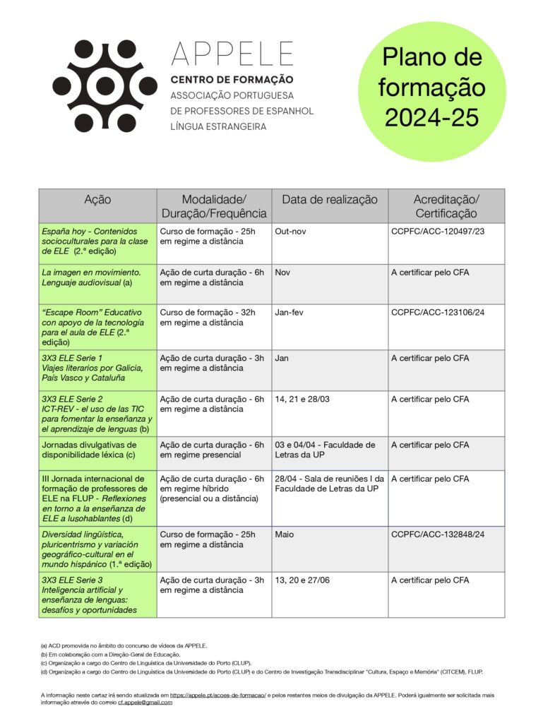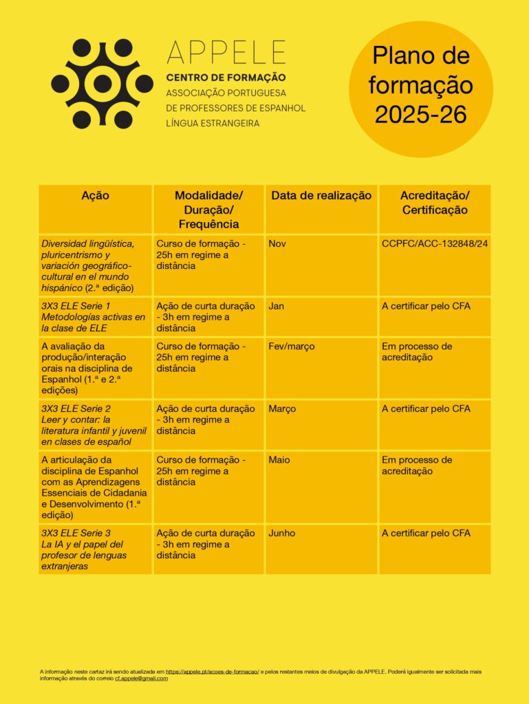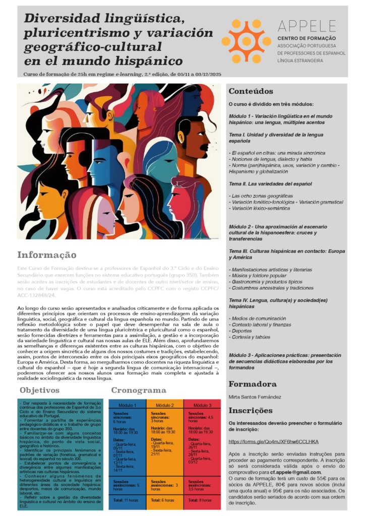 O Centro de Formação da APPELE (CFA) vai levar a cabo, no próximo mês de novembro, a 2.ª edição do curso “Diversidad lingüística, pluricentrismo y variación geográfico-cultural en el mundo hispánico”. Trata-se de um curso de formação acreditado, em regime a distância, com a duração de 25h. Encontrarão mais informações no cartaz abaixo e poderão inscrever-se aqui.