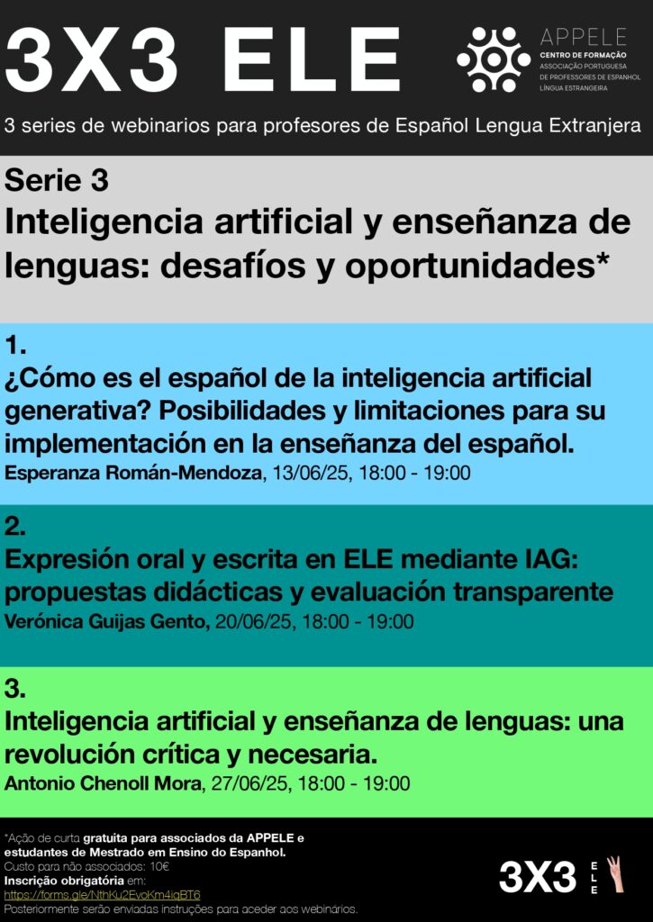 O centro de formação da APPELE vai promover a terceira série do quinto ciclo de webinários 3X3 ELE. Recordamos que cada série de 3 webinários corresponde a uma Ação de Curta Duração de 3 horas, a certificar pela nossa associação. A série 3, subordinada ao tema “Inteligencia artificial y enseñanza de lenguas: desafíos y oportunidades”, terá início dia 13 de junho. Encontrarão mais informações no cartaz em anexo. As inscrições poderão ser feitas aqui.